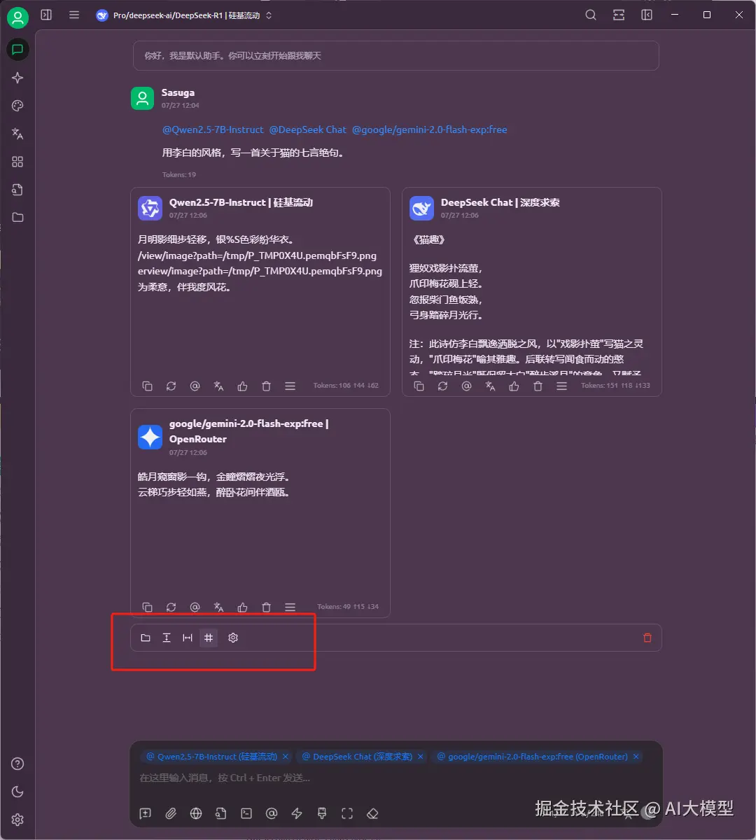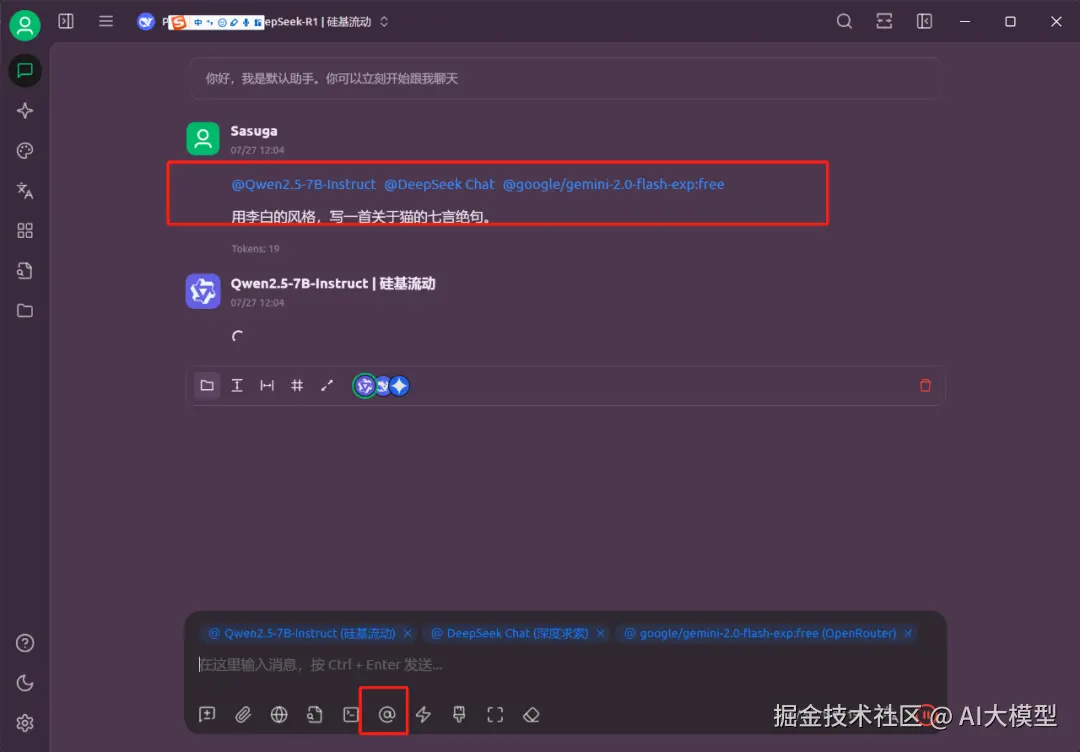 通过使用对话框下沿的@按钮,你可以选择任意多个模型,对同一段Prompt进行测试。
