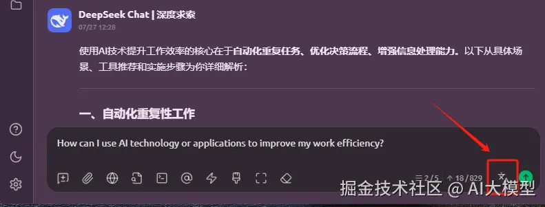对于有些国外的模型,可能将Promt翻译为英文会有更好的效果。在Cherry Studio中,只需要按一下对话框右下角的翻译按钮,就能将你已写入的提示词翻译为英文。