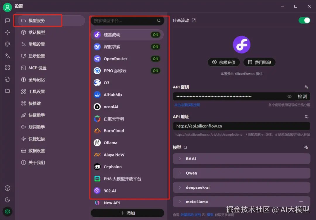Cherry Studio本身允许我们进行非常自由的模型API配置,无论是通过深度求索、月之暗面之类的模型厂商,还是硅基流动、OpenRouter之类的模型批发平台,甚至通过本地Ollama,我们都能比较便利地使用我们需要的模型。