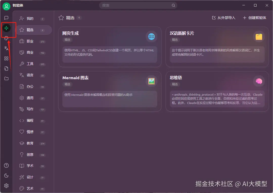 在Cherry Studio中,点击侧面栏智能体按钮,就能进入助手广场的界面。