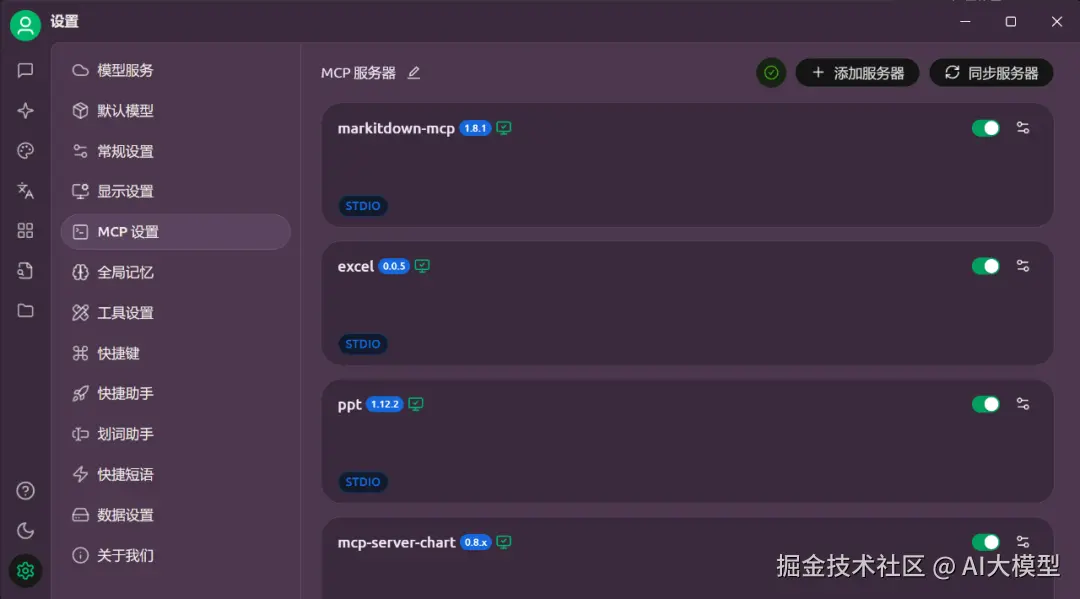Cherry Studio几乎在MCP刚推出时就上线了这个功能,具体配置方法可以参考官方文档。