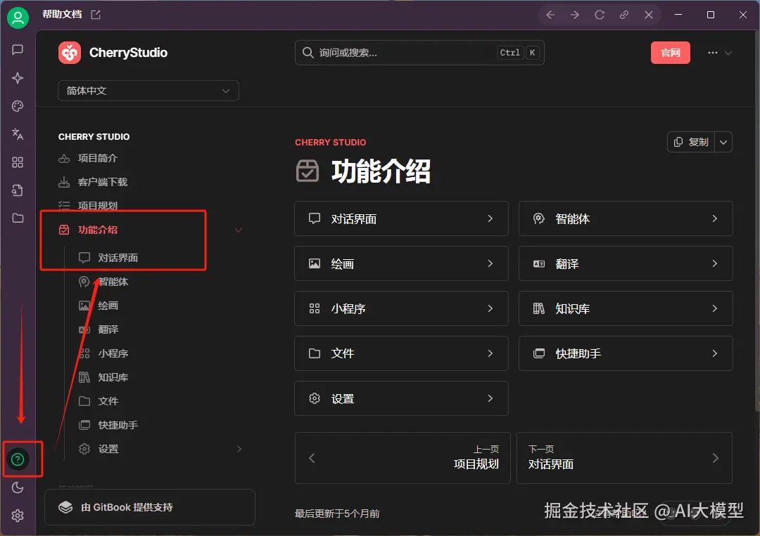 对Cherry Studio还比较陌生的朋友,建议先浏览官方帮助文档(点击软件主界面左下角小问号即可)中的功能介绍等相关部分,以熟悉基本操作。
