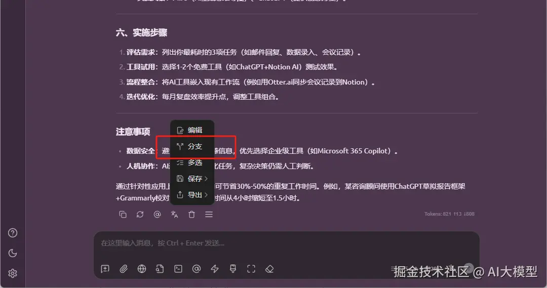 当我们想要对模型的回复从不同的角度追问时,为了防止上下文因内容过于复杂而被污染,我们可以先利用Cherry Studio提供的分支功能,”复制”出一个既有上下文完全相同的对话(即Cherry Studio中 的话题)。