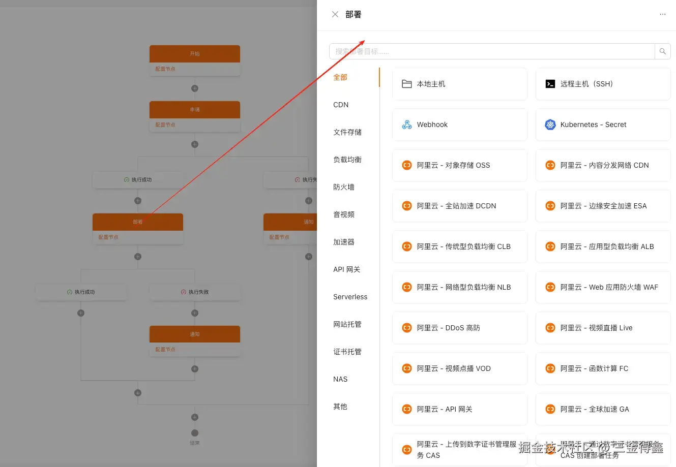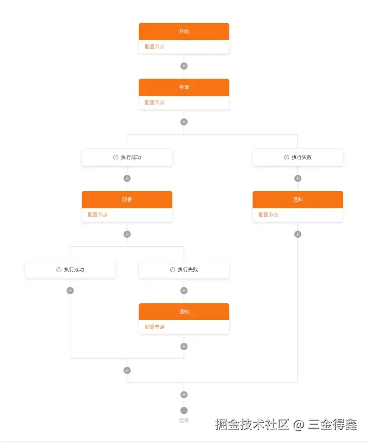 - 最后按照前一步任务是否成功,会走到不同的分支中。如果成功,那整个流程就走完结束了;如果失败会走到另外一个通知节点上,通知用户部署失败。