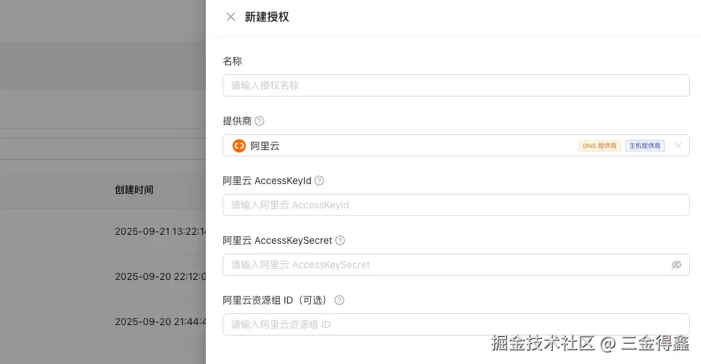 - DNS 提供商:你的 DNS 托管方,通常等同于域名注册商,用于在申请证书时管理你的域名解析记录。三金使用的是阿里云 ECS,域名也是在阿里云买的,所以这里就授权了下阿里云;