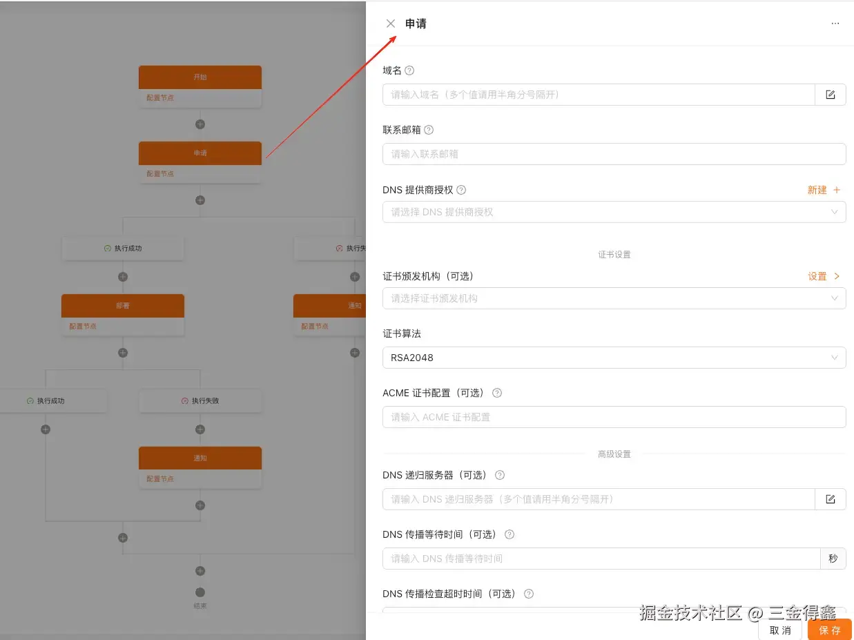 - 接下来是申请证书的节点,里面需要输入域名、邮箱和配置好的 DNS 提供商;