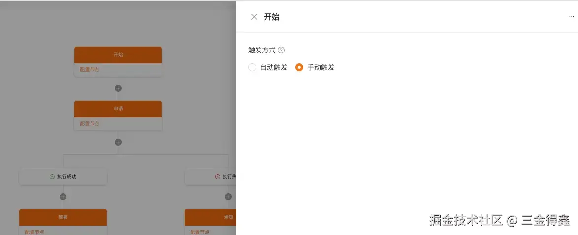 - 首先是开始节点,里面就两个选项:自动触发和手动触发。