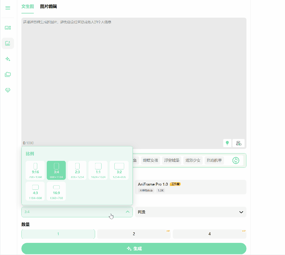 萌动AI的生图板块支持文生图和图生图,我们可以在生成的时候根据自己的喜好来选择图片比例以及风格,目前支持动漫、漫画、中国风、风景、网漫以及3D动画这几种常见风格。