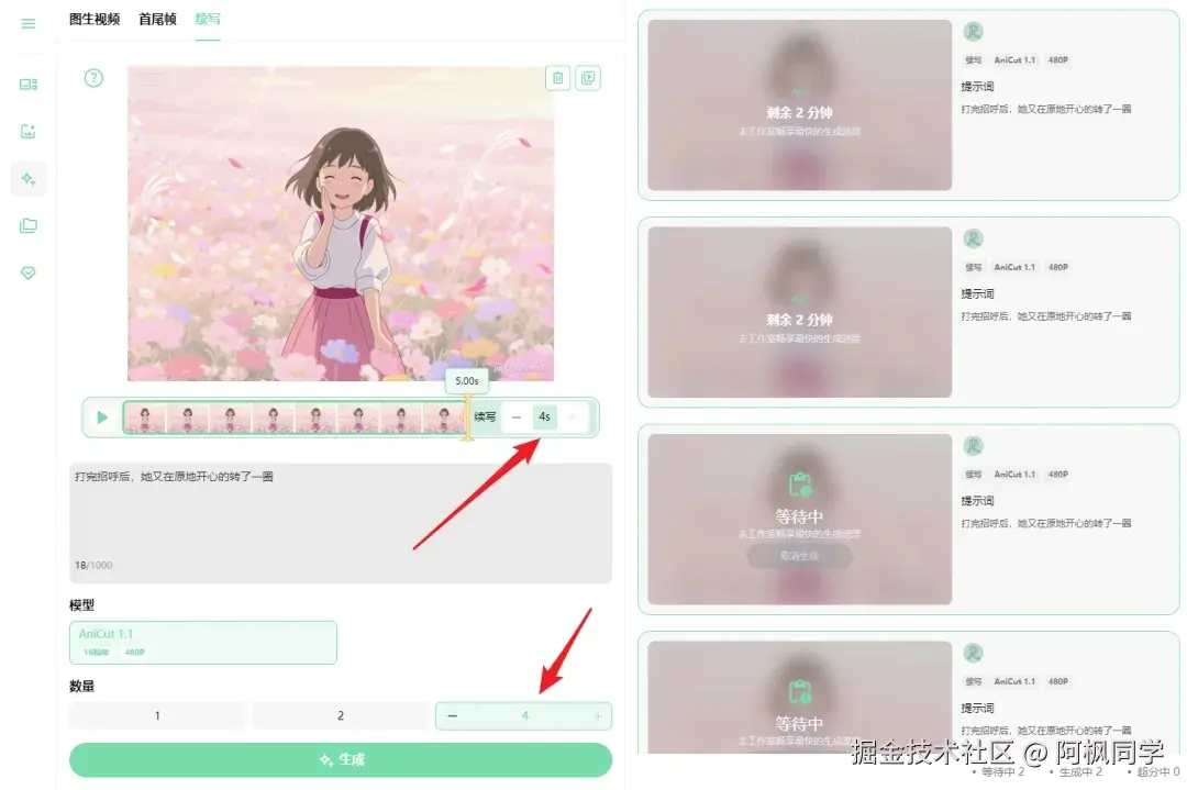 如果你觉得5秒的视频太短了,那么还可以针对目标视频输入提示词进行“续写”,最长可一次性续写4秒,最多能一次免费生成4个视频,这就有点牛逼了。