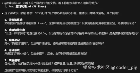 复制粘贴,然后做下调整 (玩法简化),接着让 CC 看下玩法文档有没有什么问题: