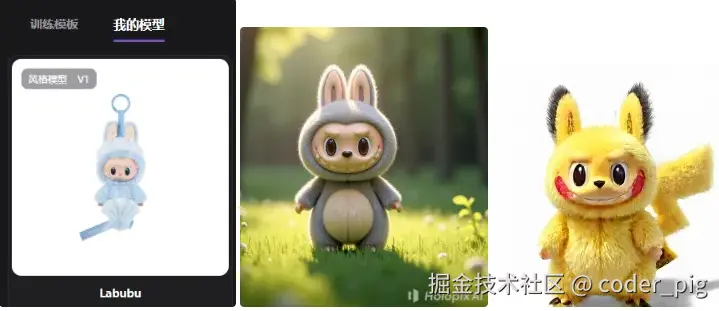👏 Nice,接着就是 玩法细化 + 游戏美化 了,素材生成依旧用的 Holopix AI,出图 速度 和 质量 都非常稳定,价格也 便宜 (256*256,生成一张约 0.026元),不同风格的 预设模型,保证了出图 "风格的一致性"。还支持上传图片训练自己的 "专属模型",😄 比如杰哥写爬虫采集了一波 Labubu 的商品图片,然后训练了一个专门用来生成 Labubu 图片的模型: