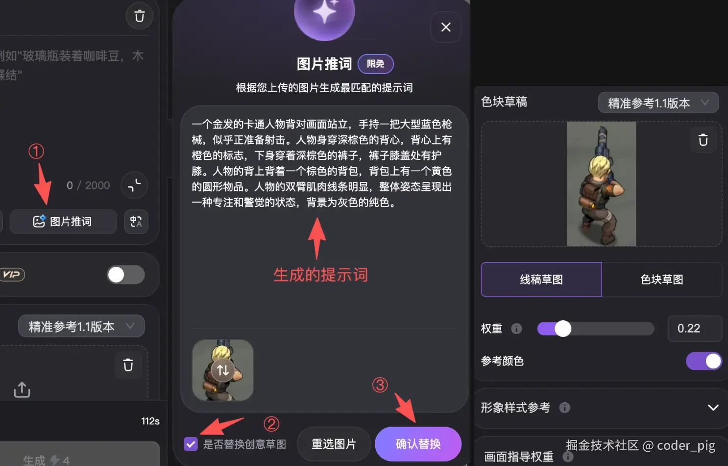 🤔 如何快速 "复刻" 出同款图片素材 (动作、姿势、服饰等)?常规套路有两,这里先用第一种 "图片推词 + 创意草图"。如图,依次点击:图片推词 → 选择要推理的图片 → 勾选替换创意草图 → 确认替换:
