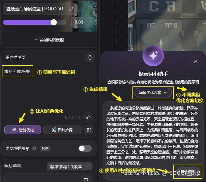 Holopix AI 首页点击「一键成稿」,选模型 → 场景 → 搜 "竖版" → 「竖版空白场景模型 | HOLO-V1」,在 "正向描述词" 处简单写下描述词,点击 "智能优化" 让AI润色,然后 "确认使用":