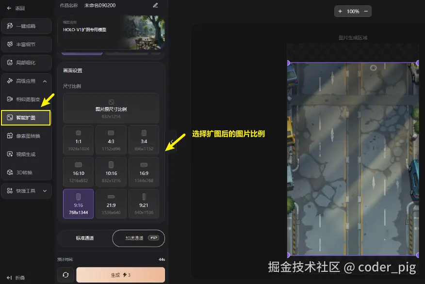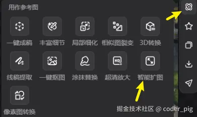 👏 Nice,运气不错,这波 "抽卡" 生成的素材很满意。然后图片的 宽高比例,我希望是 "9:16" 的,直接鼠标移动到图片上,点击 "用作参考图" 的图标,然后选择 "智能扩图":