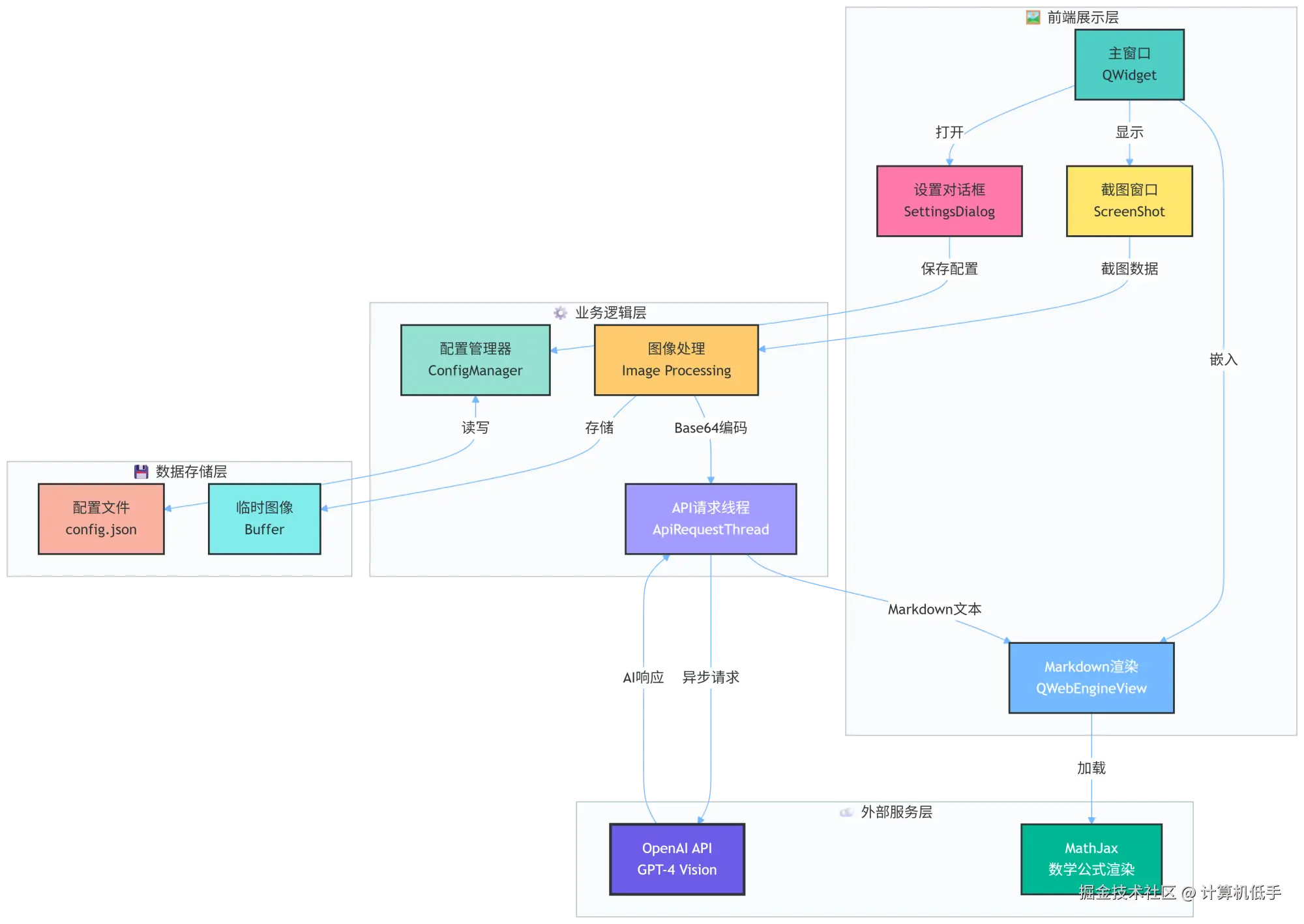 - 功能特点包括智能截图、AI图像识别、自动解题、数学公式渲染、Markdown渲染、简洁的GUI视窗界面等