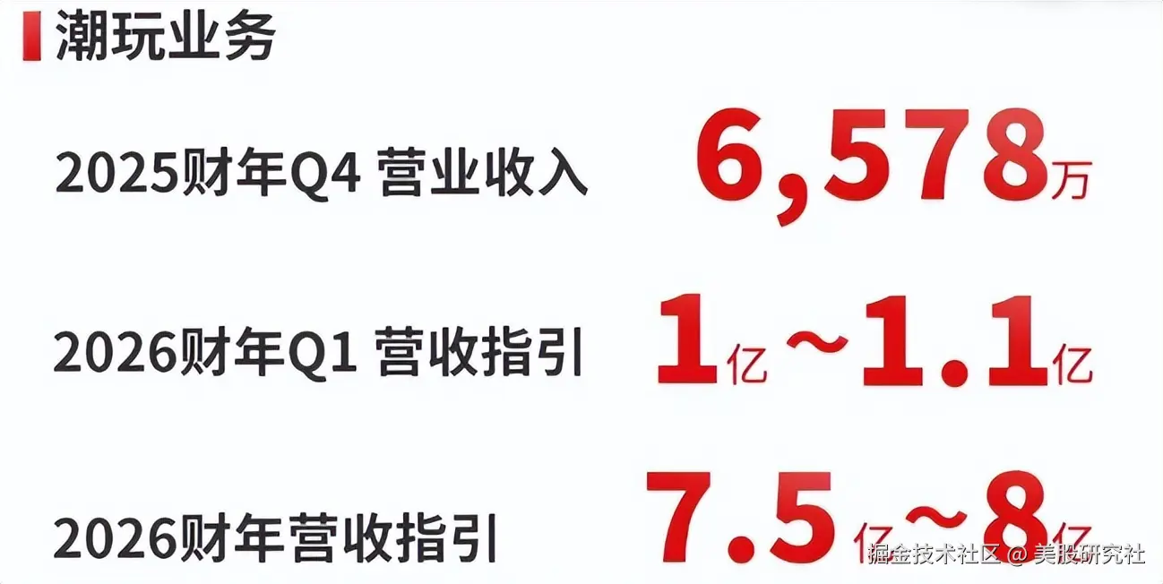 在此基础上,还需要考虑新业务的高成长性。财报中,量子之歌给出2026财年潮玩业务7.5-8亿元的营收指引,若达成,意味着十倍起步的增长空间。