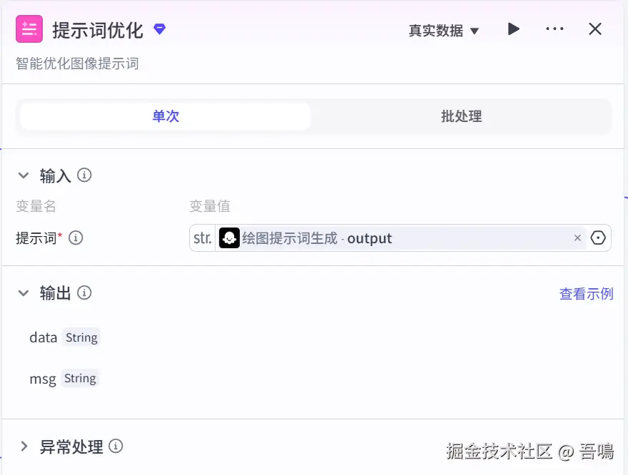 使用了扣子官方的【提示词优化】节点,因大模型输入的提示词还不够成熟,因此需要通过这个节点做下优化,排除掉一些敏感词,增强一下美感,使得图片质量更高。