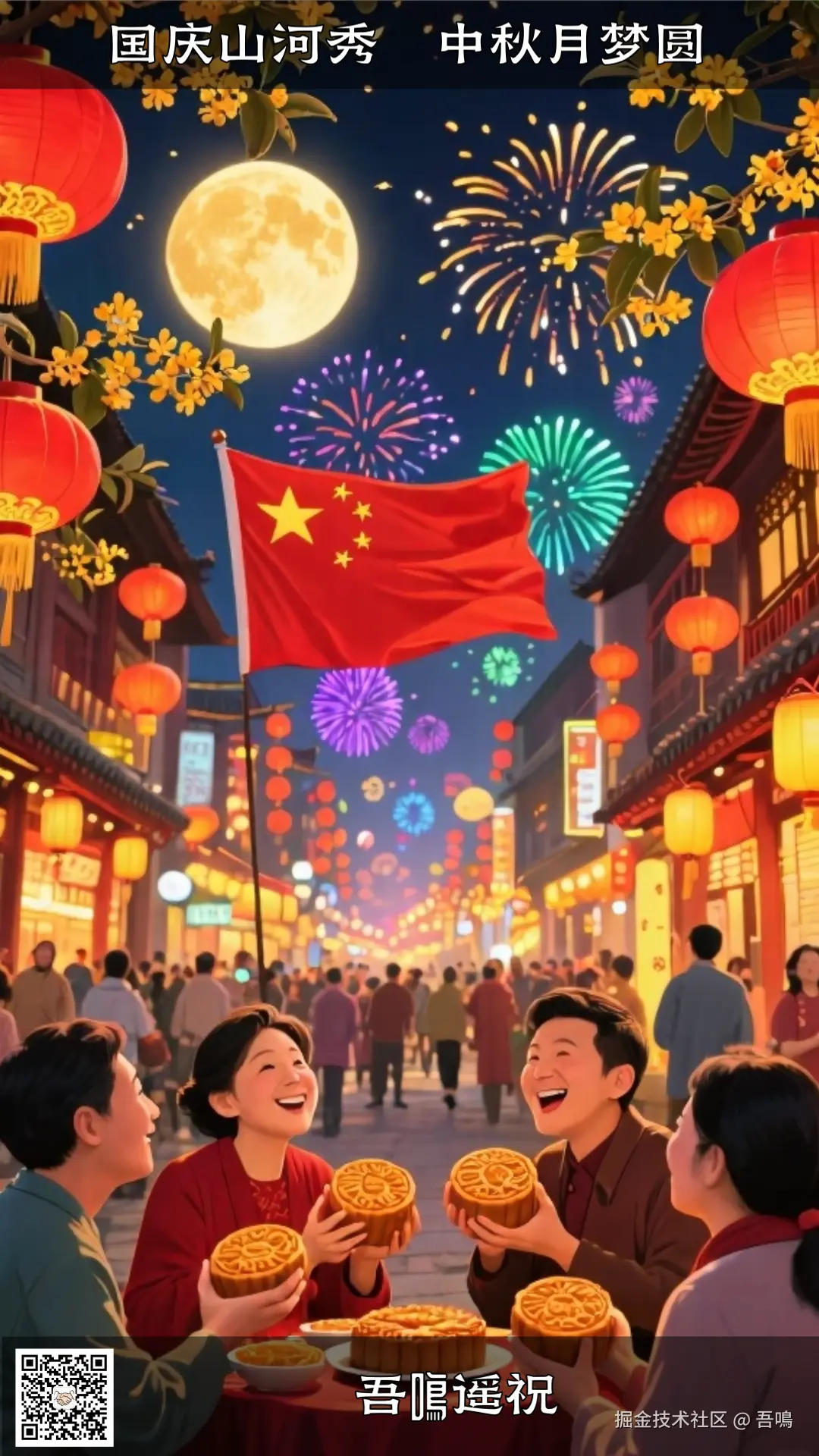 在开始工作流的详细介绍之前我们先来看看工作流运行的效果,比如我输入了一个“国庆+中秋”的节日主题,经过了30S的运作,一张以“国庆+中秋”为主题的海报就生成了,效果如下。