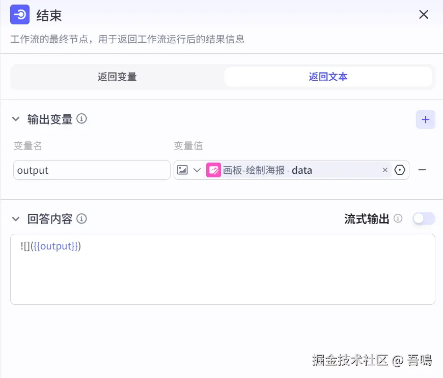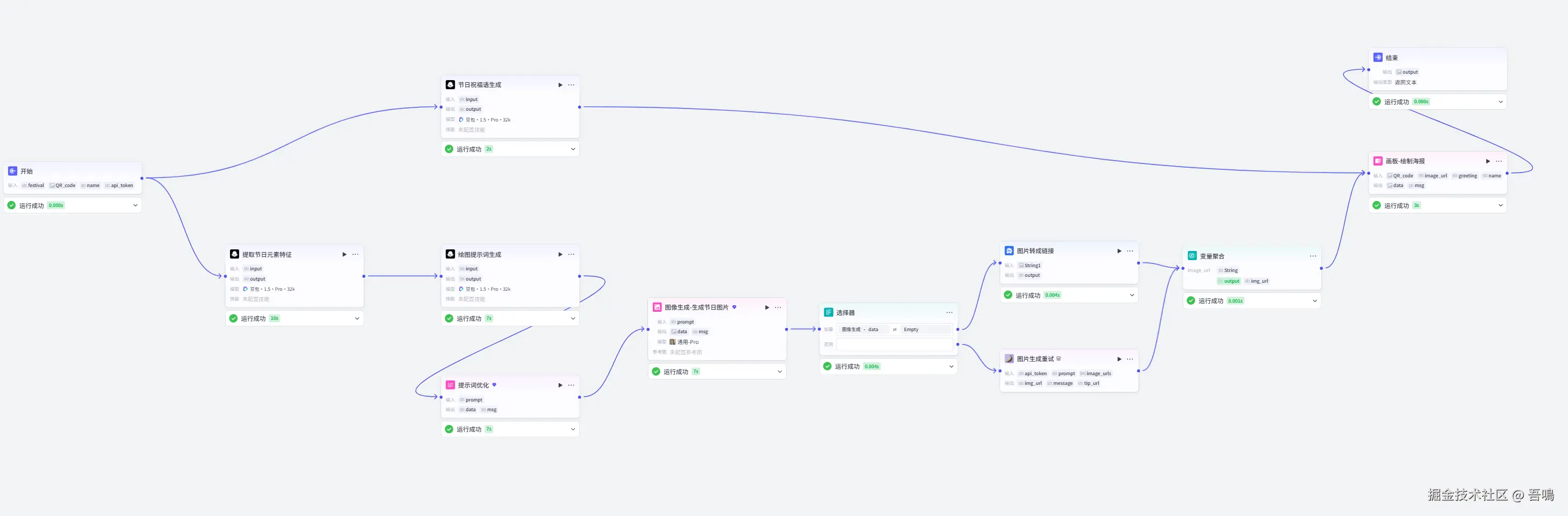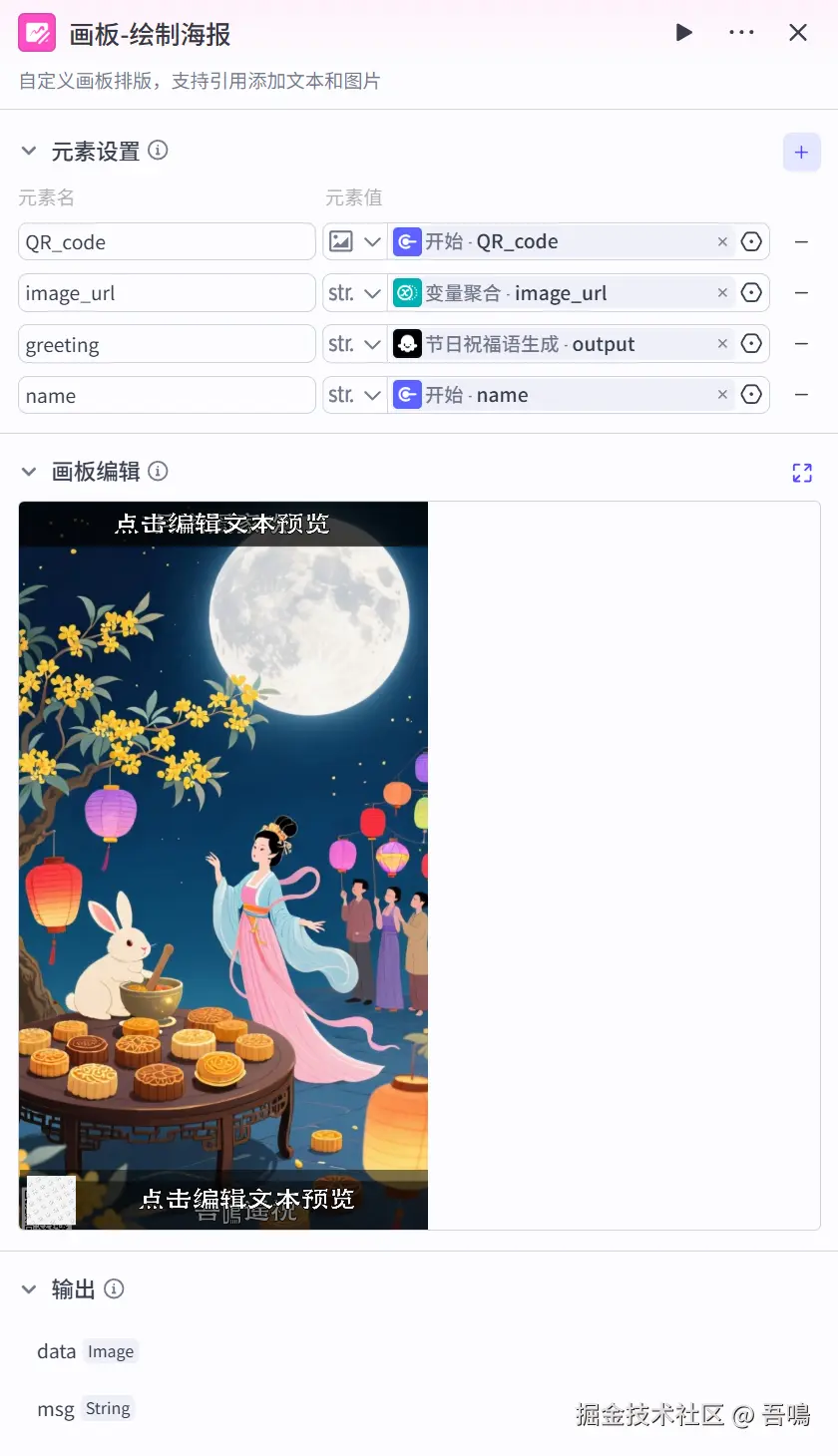 5、海报合成:把生成的祝福语、节日海报图片、你的logo、海报赞助商等信息,使用画板节点合成节日海报。