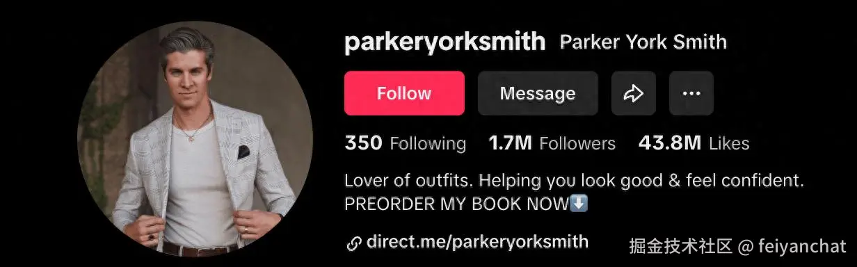 案例:Parker York Smith的简介“帮你穿出自信,感受自信”直接说明了关注他能获得什么价值。