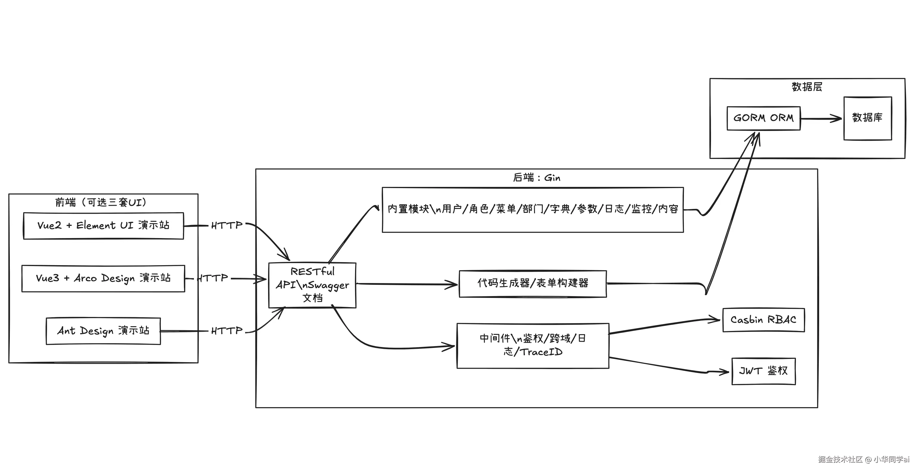 - 后端基于 Gin,提供中间件(鉴权、跨域、访问日志、Trace ID 等);