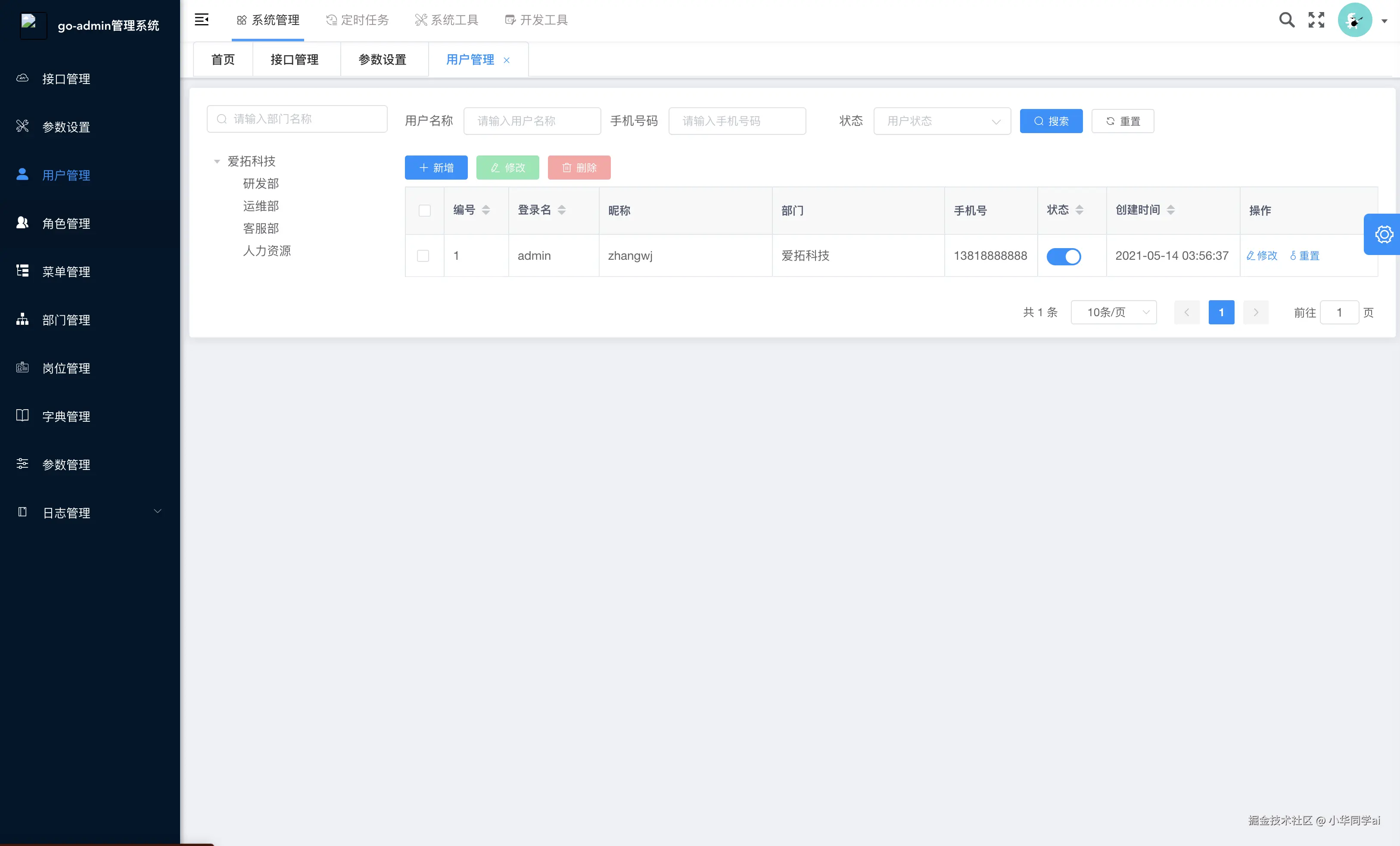 migrate初始化数据库资源,server启动服务,流程清晰。 - 内置管理模块:用户、部门、岗位、菜单、角色、字典、参数、操作日志、登录日志、服务监控、内容管理等常见模块。