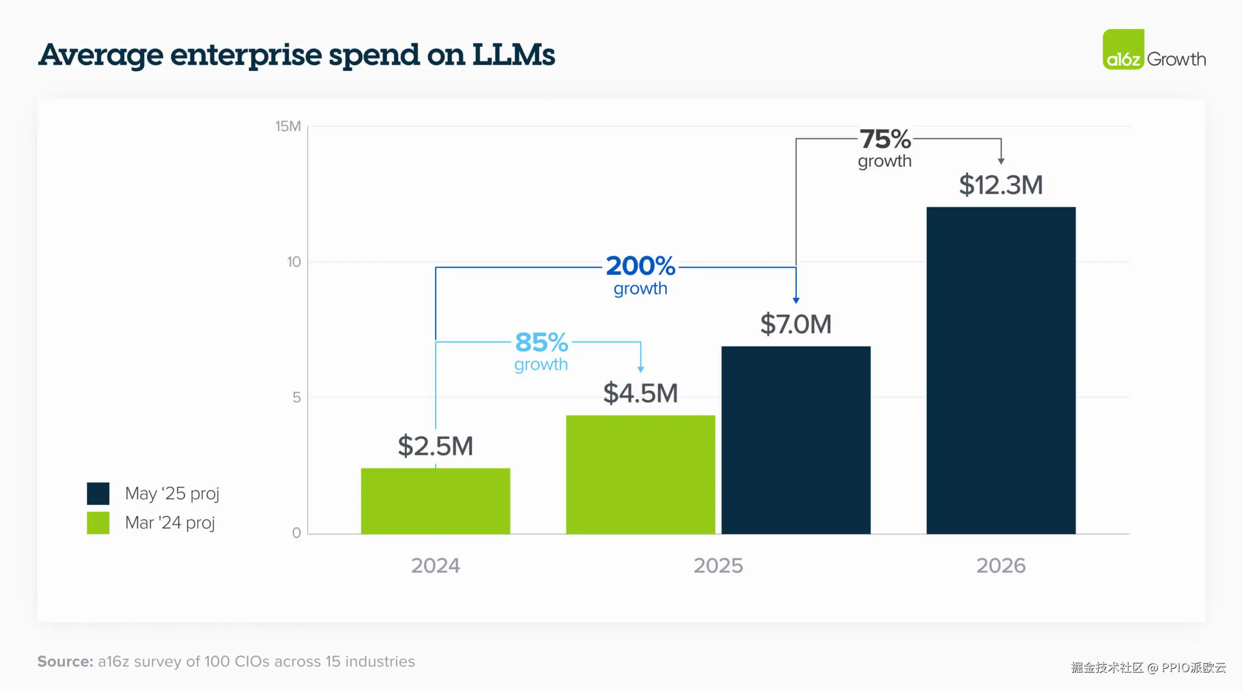 LLM 预算的增长超出了企业一年前(本已很高的)预期,并且没有迹象表明这种增长会放缓。企业领导者预计未来一年平均增长约 75%。正如一位 CIO 指出的:“我在 2023 年的花费,现在一周就花完了。”