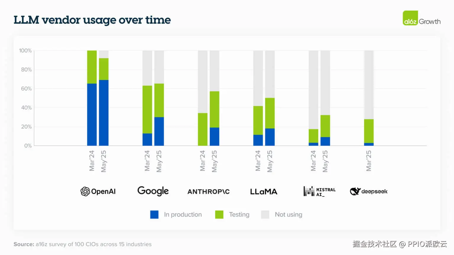 企业在混合搭配多种模型以在性能和成本之间进行优化方面变得更加成熟。OpenAI、Google 和 Anthropic 占据了总体的主导市场份额,而 Meta 和 Mistral 在开源选项中很受欢迎。