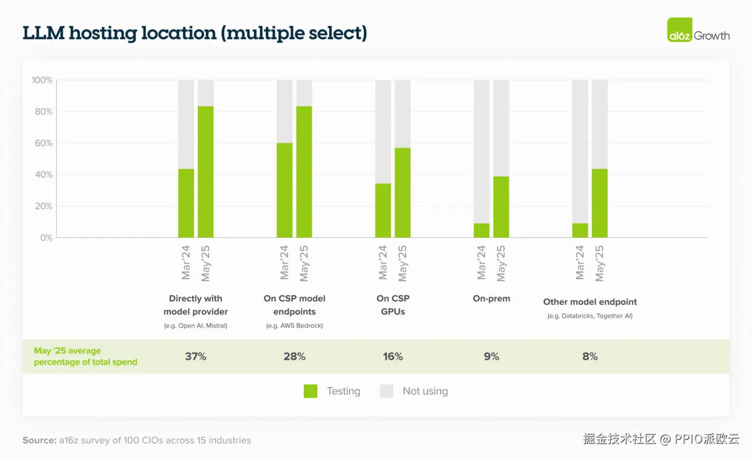 去年,创新预算仍占 LLM 支出的四分之一,现在这一比例已降至仅 7%。企业越来越多地通过集中化的 IT 和业务部门预算来支付 AI 模型和应用程序的费用。 这反映出一种日益增长的情绪,即生成式 AI 不再是实验性的,而是对业务运营至关重要。一位 CTO 指出:“我们更多的产品正在增加 AI 功能,因此我们的支出增长将在所有这些产品中上升”——这表明向核心预算的转变只会加速。