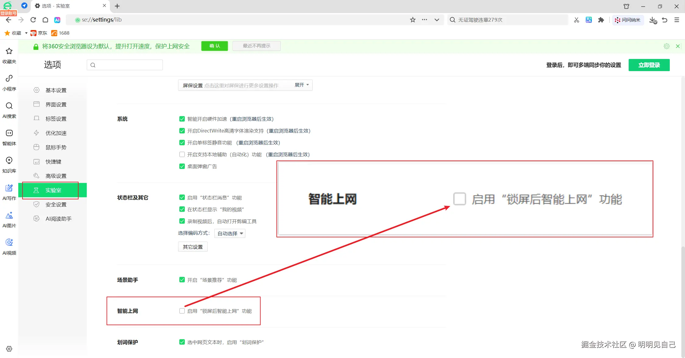 一开始也没在意,直到今天去搜了一下,才发现是360又在背后上手段了。在新版360浏览器中,增加了一个叫 “智能上网” 的功能,实际上就是会在锁屏后自动打开浏览器。解锁以后,首先映入眼帘的就是它,之前我一直以为是自己忘记关了。