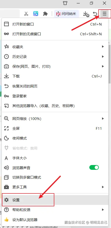 在360浏览器中,点击右上角的三道杠打开菜单,在下拉菜单中选择设置。