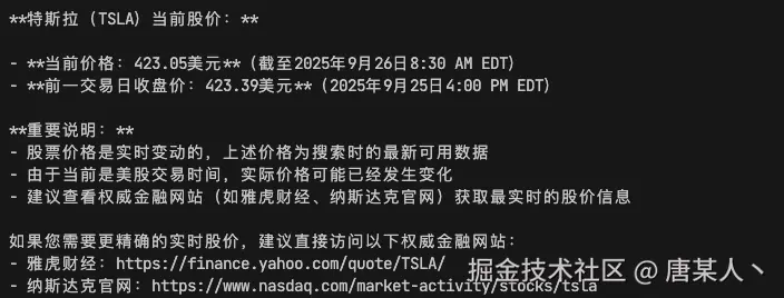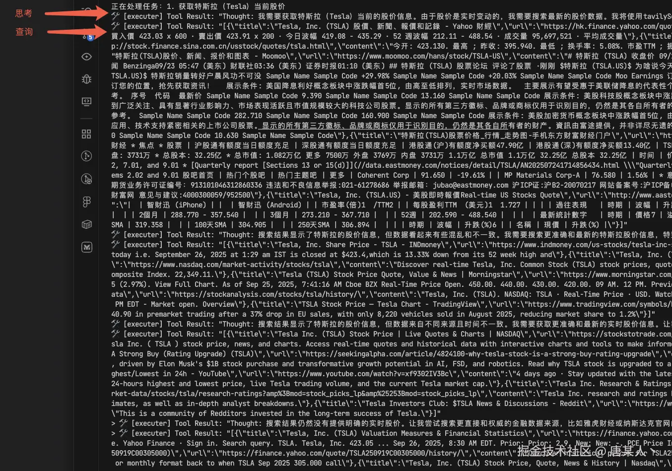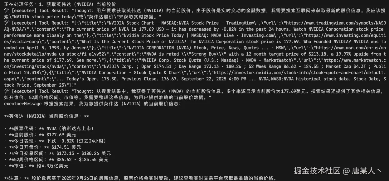 第二次循环中,Executer Agent 取到的第一个任务是 “获取英伟达(NVIDIA)当前股价”,于是它开始查询英伟达股价,并最后结果也记录起来。