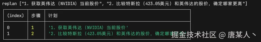首先是实现一个 Plan 规划器。它的主要任务就是像一个主管一样,先分析用户提出的问题,然后拆分成一步步可以执行的小任务,最后分配给“小弟”们执行。例如,下面我问的是“特斯拉和英伟达,谁的股价更高”,它于是给出一个执行计划: