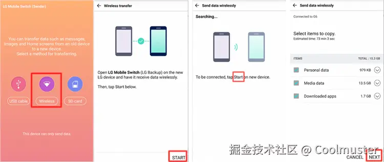 步骤3:设置LG设备接收数据并开始传输。只需在三星手机上单击“开始”,然后在LG手机上单击即可。