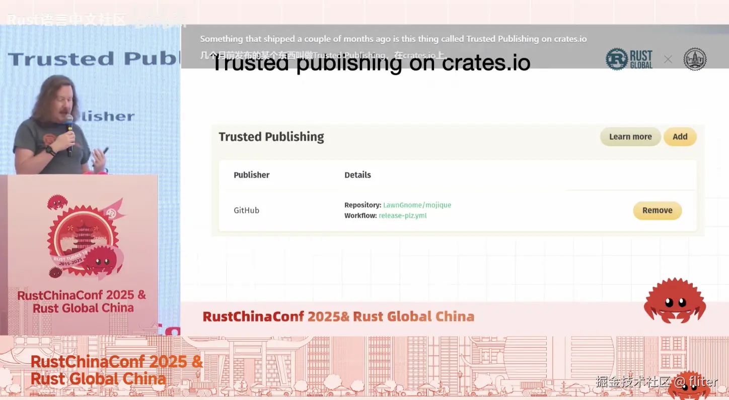 稍微有点好消息的是,这是一类大公司非常关心的问题,因为他们需要自己的代码是安全的。所以有不少项目(包括我自己的岗位)是在被资助的前提下开展,目的就是发现这些问题并进行防御。现在有相当多的工作在推进这些缓解措施。几个月前一个已经上线的东西叫“Trusted Publishing”(可信发布),在 crates.io 上。感谢资助该工作的 Alpha Omega (译者注: 2022 年 2 月成立的一个项目, "其使命是通过促进最关键的开源软件项目和生态系统的可持续安全改进来保护社会。该项目旨在构建一个关键开源项目安全、安全漏洞被快速发现和修复的世界" )。它允许你把整个 crate 的发布过程完全放在 CI 中进行。目前只支持 GitHub Actions,但计划将来支持其他平台。当然,以我作为 crates.io 团队成员的身份来说,我们非常欢迎外部贡献。
