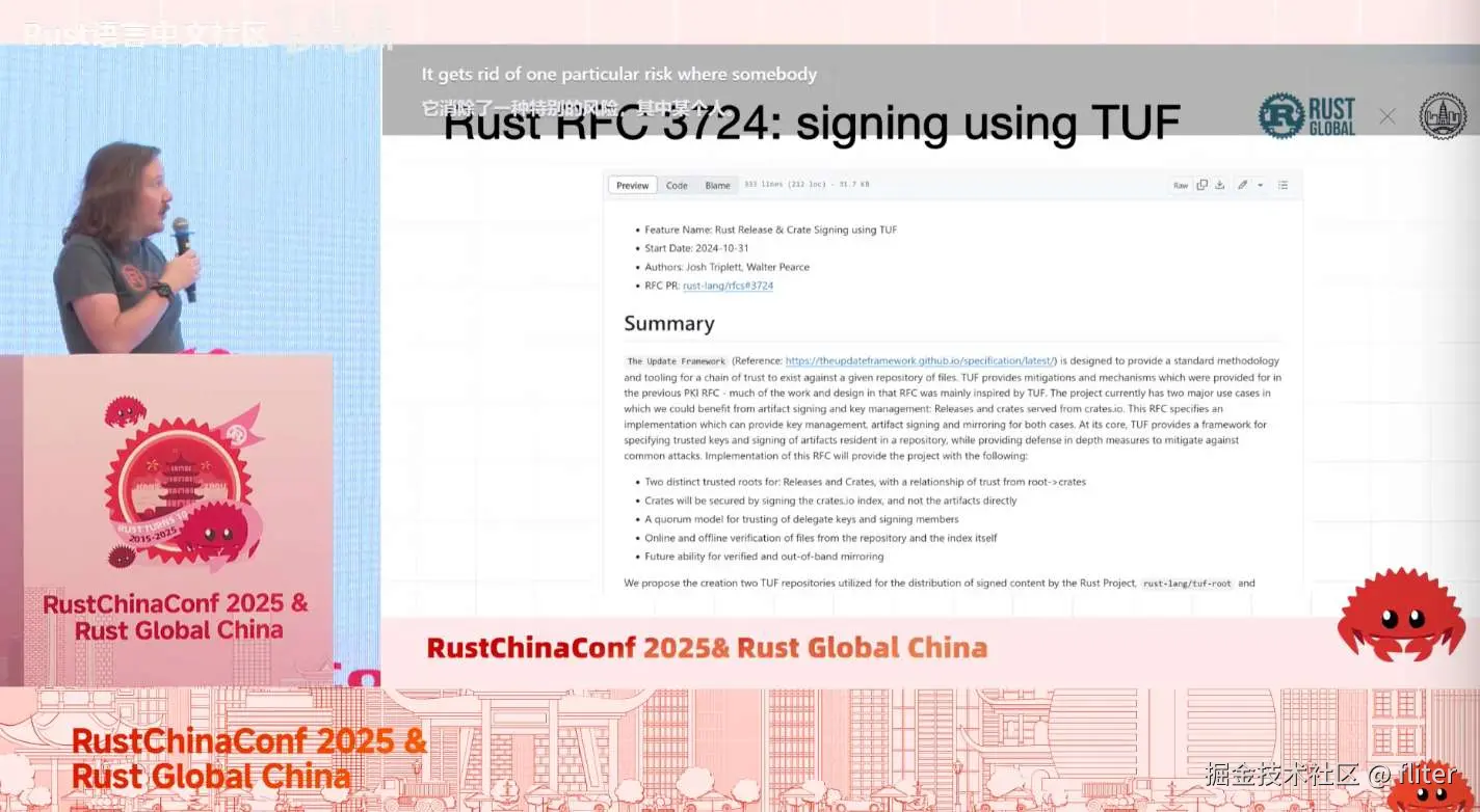 还有一个在进行中的项目,是使用 TUF 这套可信链来为 crates 和 Rust 发行版做签名。共同作者 Josh Triplet 今天也在现场,你可以找他聊聊。这会解锁很多事。短期内,一个关键能力是:可以把 crates 和 Rust 发行版安全地镜像到那些不能不受限访问互联网的环境里。长期看,它也将为 crate 作者发布带有证明(attestation)的 crate 提供基础组件,用以声明“这确实是我打算发布的东西”,并建立信任链。