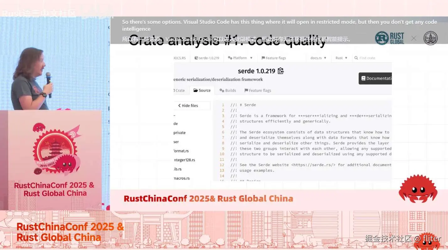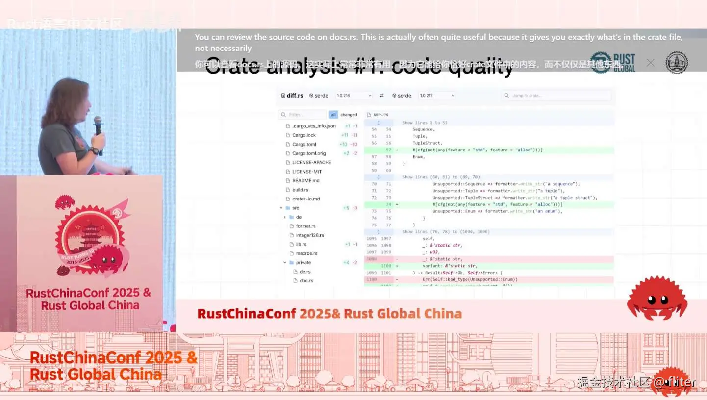 你可以在 docs.rs 上看源码,这其实经常很有用,因为它展示的是 crate 包里实际发布的内容,而不是仓库里可能不同步的内容;你也可以去看仓库,但它不一定与发布包匹配。lib.rs 会告诉你仓库和发布包是否匹配。我们在 Rust 基金会内部也有这方面的跟踪,我很惭愧的是过去一年没来得及把它做成公开看板,但我会的,我保证。