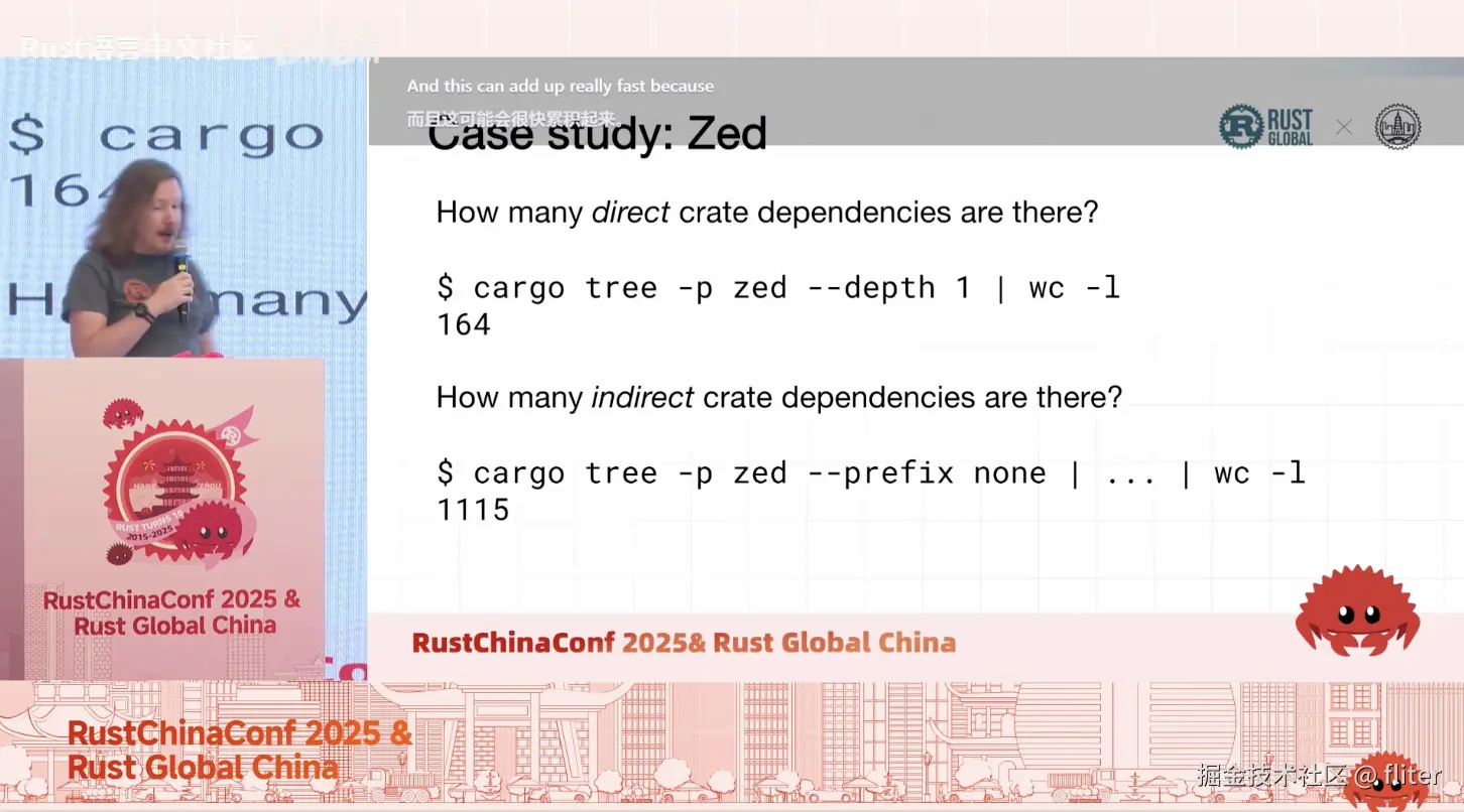 比如这个文本编辑器 Zed,有些人可能听说过,它完全用 Rust 编写。Zed 直接依赖(屏幕上有)164 个 crate,但当你查看整个依赖树时,会拉进来 1115 个依赖。这就意味着有 1115 个 crate 必须是安全的。我就不在这里展示 cargo tree 的输出了。我尝试过把它画成图,但效果并不好。重点是:依赖真的很多。
