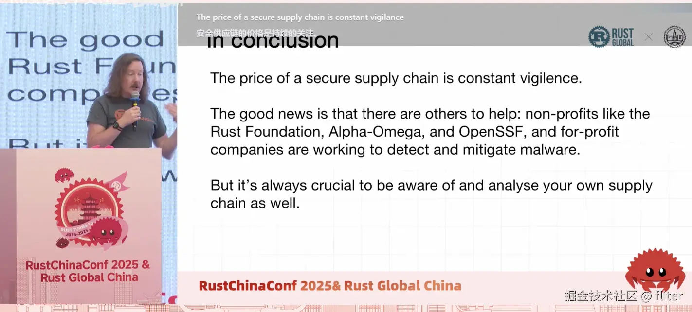 总结一下,安全供应链的代价是持续的警惕。有许多参与者,包括 Rust 基金会、Alpha Omega、OpenSSF 等,都在关注整个生态(不止 Rust,也包括 Python 等),努力让事情尽可能安全。但到某个节点,你也需要审视自己的依赖,确保自己在引入、使用以及更新依赖时做出好的选择。希望这次演讲至少介绍了一个你可以用上的工具,帮助你在此过程中做出更好的决定。非常感谢你们的时间,也感谢邀请我来这里。