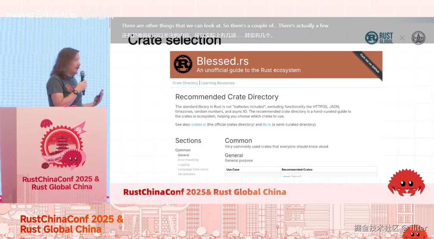 我们还能看其他东西。有一些努力在尝试对 Rust 生态里的 crate 做分类,并标注“推荐、广泛使用、高质量”等。这是一个叫 blessed.rs (译者注: Rust 生态系统的非官方指南, 愤懑别类推荐了很多Rust生态的库) 的站点,网址就是那个。我挺喜欢。还有别的,比如 awesome Rust,还有一些更聚焦的清单,如 async、embedded 等。这些都可能是很有用的工具,但它们的可信度取决于来源。