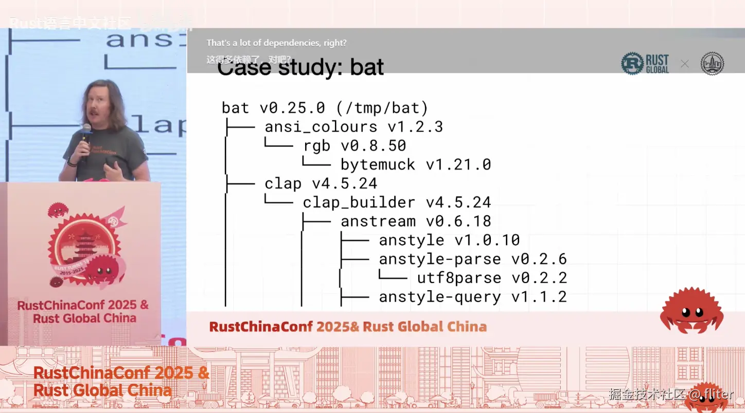 即便是更小的项目,比如 BAT(一个用 Rust 写的更好的 cat 替代品),也有 30 个直接依赖和 119 个传递依赖。其中很多是我在工作中常见的,比如做命令行解析几乎都会用到 clap。我的工作经常是写一些一次性分析用的小工具。我会说,这些项目平均都会拉进 80 到 100 个依赖。这还不包括任何异步相关的内容,比如 Tokio 等等。总之,东西很多。