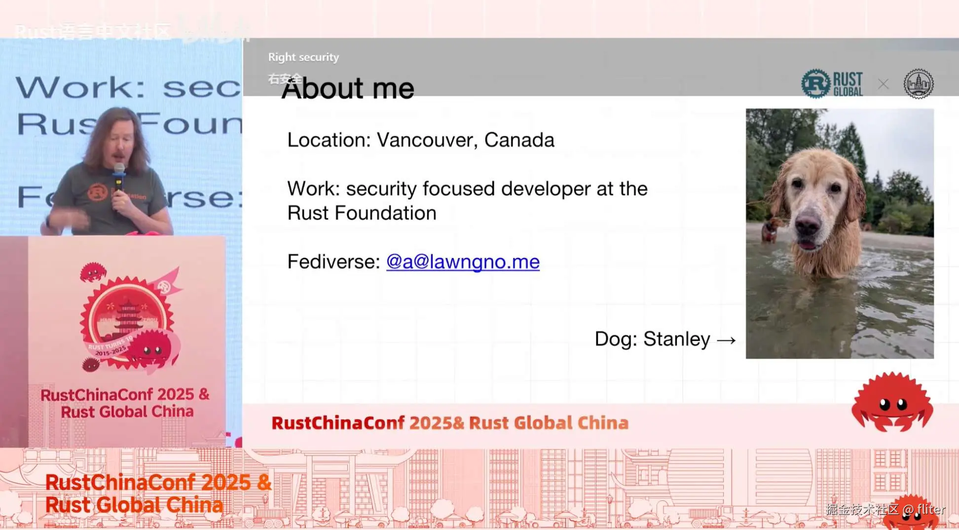我在 Rust 基金会担任软件开发工程师,主要专注于生态系统安全。实际工作中,主要是尝试在 crates 里发现恶意软件,并协助处理一些事件,比如昨晚有些人可能看到的,有人试图冒充 crates.io 来窃取大家的 GitHub 令牌。那挺“有趣”的,导致我比预期更晚才睡。我同时也是 Rust crates.io 团队的成员。我应该说明一下,尽管我今天穿着这件 T 恤,我并不是以 Rust 基金会的官方身份发言。但如果我说了什么很聪明的话,那肯定就是 Rust 基金会的官方立场。
