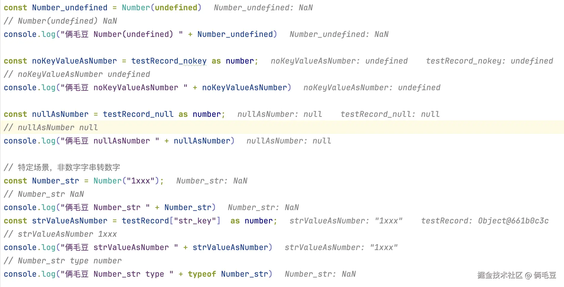 对应的log输出及编译调试时的变量状态的截图,可以看出,Number(...)操作在强转时会把null和undefined强转为0和NaN。而... as number的操作对于null和undefined强转之后的结果依然是null和undefined。当输入的数据为非纯数字的字符串时,Number(...)操作在强转时会把非纯数字的字符串强转为NaN,而... as number的操作对于非纯数字的字符串强转之后的结果依然是原字串。这时如果判断数字是否有效,使用的方式也是需要分别对待。个人建议应该先对该原值进行有效性判断之后,再进行数值的转换,再进行一次数值的有效性判断。注意,NaN的类型是number
