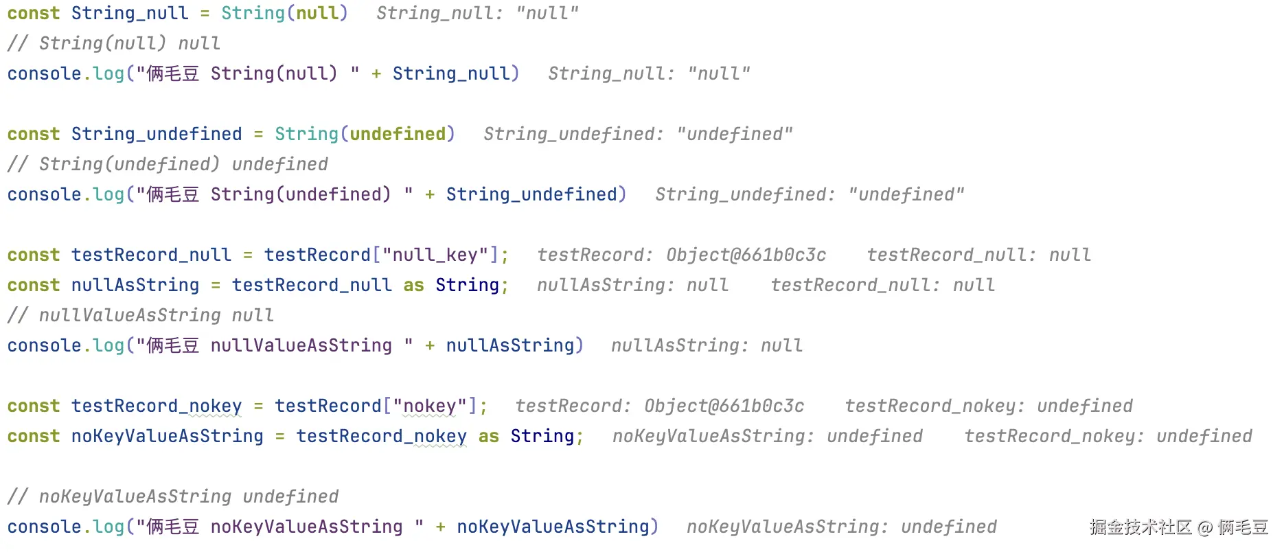 对应的log输出及编译调试时的变量状态的截图,因为log输出是没有双引号的,需要注意一下实际的变量值,可以看出,String(...)操作在强转时会把null和undefined强转为"null"和"undefined"。而... as string的操作对于null和undefined强转之后的结果依然是null和undefined。这时如果判断字符串是否有效,使用的方式就有所不同了。或者应该先对该原值进行有效性判断之后,再进行字符串的转换。