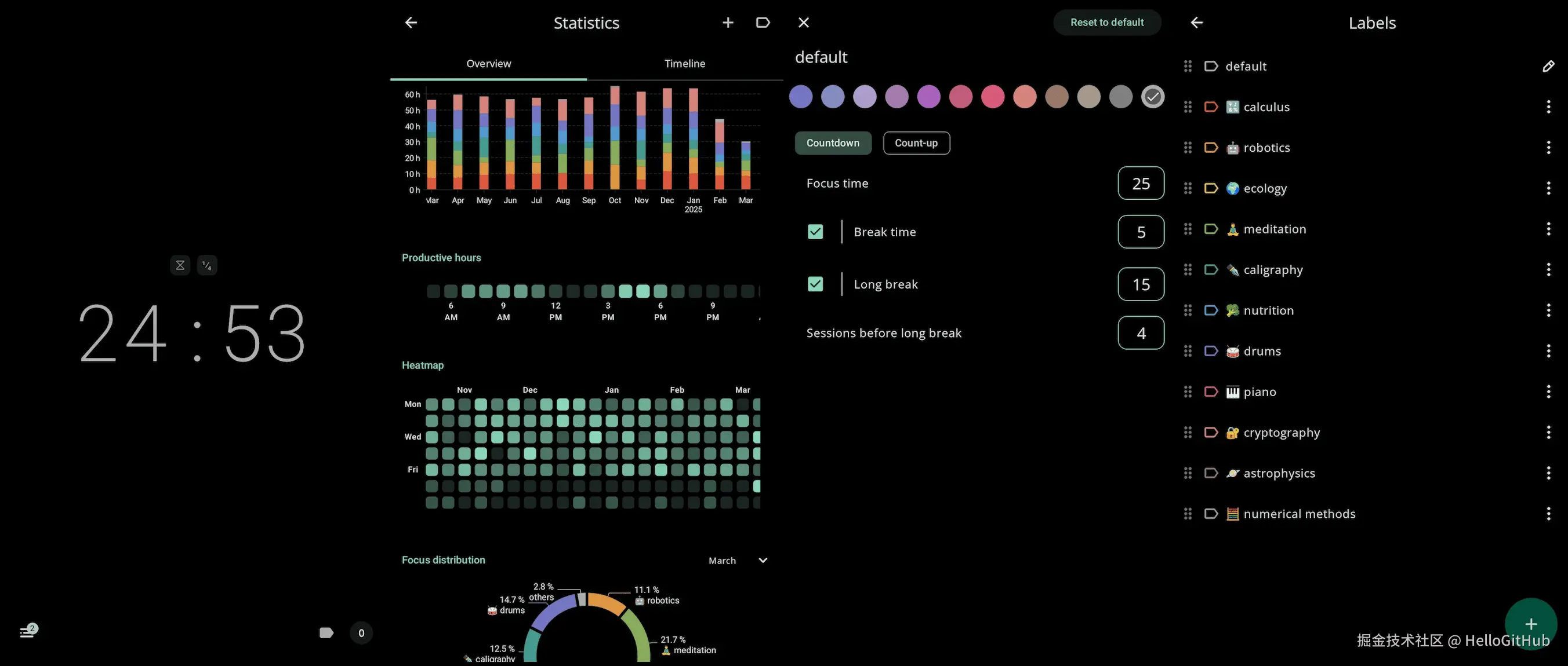 19、goodtime:极简省电的番茄时钟工具。这是一个开源的 Android 时间管理工具,基于番茄工作法帮助用户管理时间、提升专注力。它无广告、无追踪、完全离线,支持历史记录、彩色标签、热力图统计、专注/休息比率、自定义样式等功能。来自 @ewiro 的分享