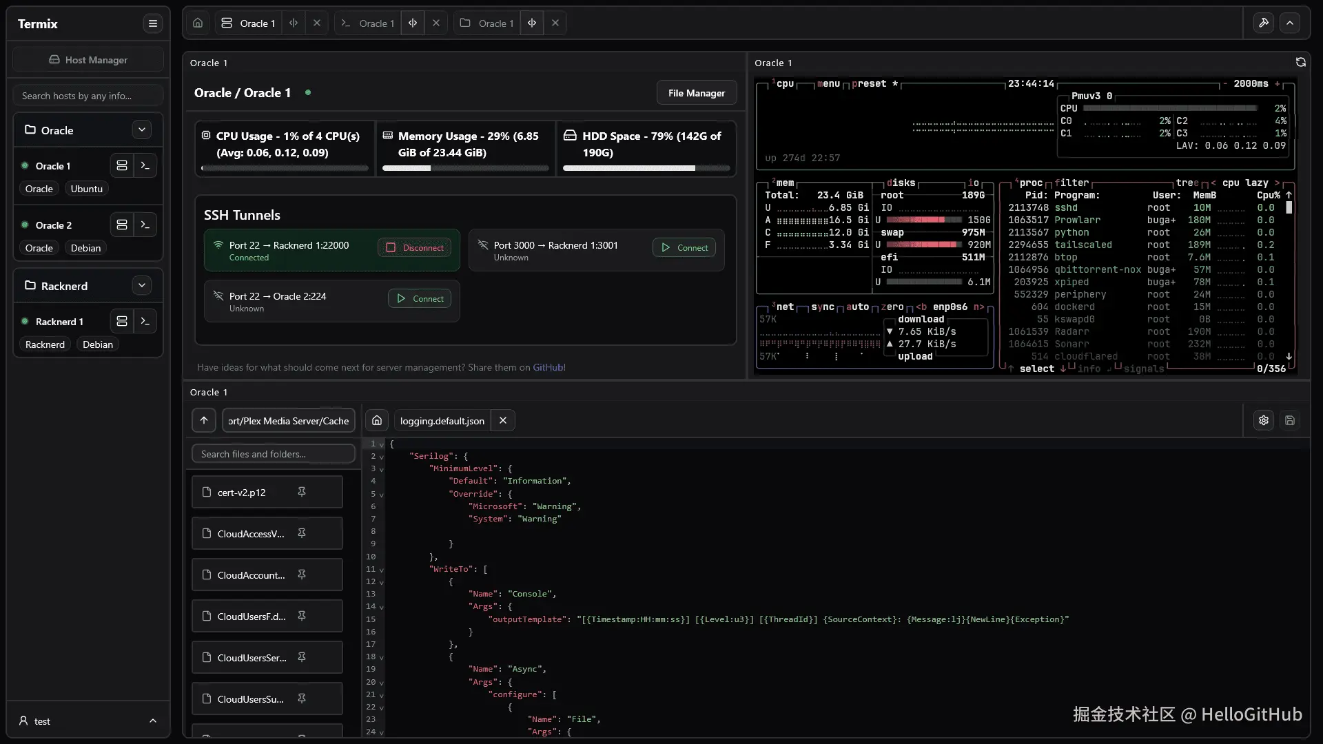 17、Termix:高颜值一站式服务器管理平台。这是一个基于 Web 的服务器管理平台,集成了 SSH 终端、SSH 隧道、服务器监控和文件管理等功能。它完全免费开源、可自托管,支持自动重连、文件上传、分屏显示和语法高亮等特性。来自 @DeShuiYu 的分享