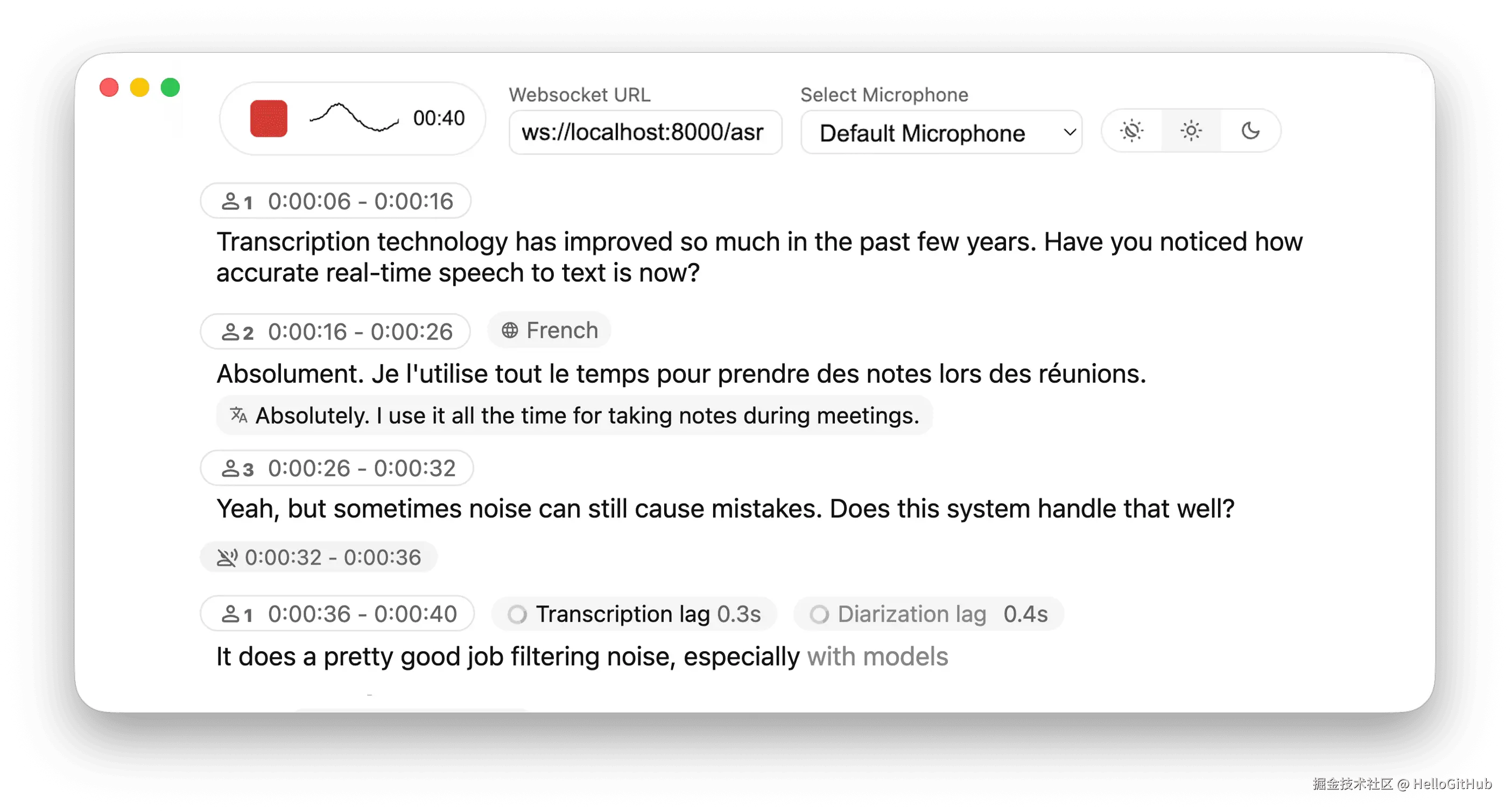 33、WhisperLiveKit:开箱即用的本地语音转写工具。这是一款集实时语音转文本、翻译和说话人分离于一体的开源工具,自带服务器端和 Web UI,一条命令即可私有化部署。它基于最新的增量流式技术,无需联网和写前端代码,就能实现超低延迟的会议实时记录和跨语言交流。