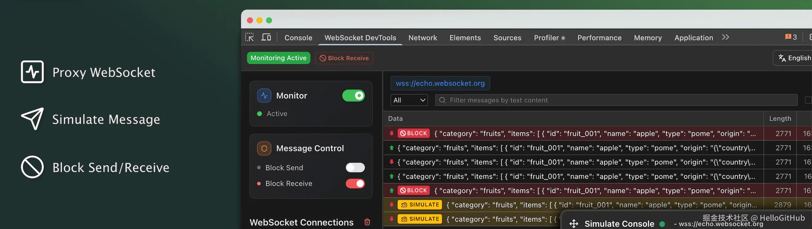 18、websocket-devtools:开箱即用的 WebSocket 调试工具。这是一款专业的 WebSocket 调试与流量控制浏览器插件,安装后会在 Chrome DevTools 面板中新增一个标签页。操作便捷,支持 WebSocket 流量的实时监控、消息模拟和流量拦截等功能。来自 @孤胆枪手 的分享