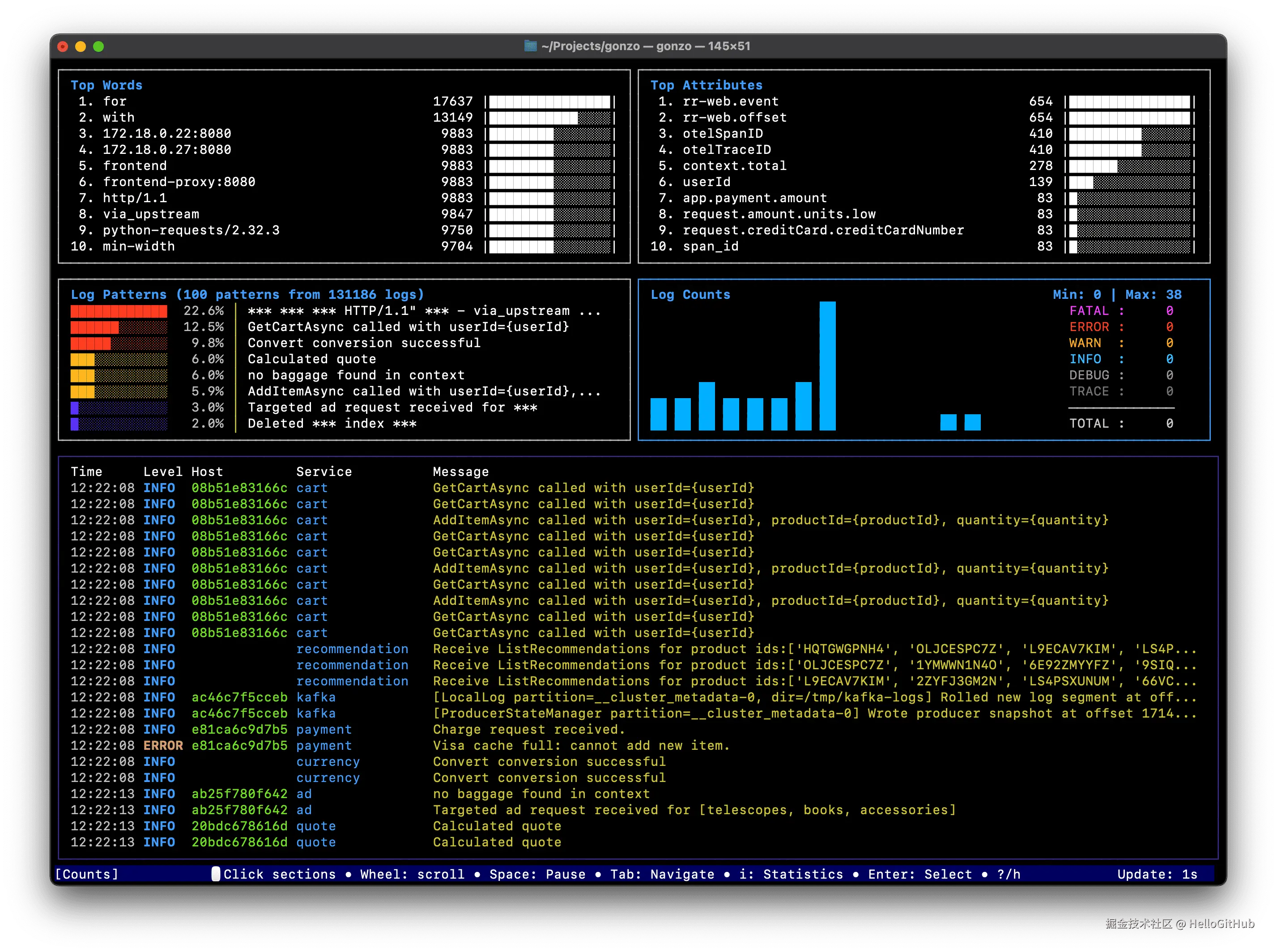 10、gonzo:终端用户界面日志分析工具。这是一个用 Go 语言开发的终端(TUI)日志分析工具,灵感来自 k9s。它支持在终端界面下实时分析、过滤和可视化日志,结合 AI 提升日志洞察能力,适用于日常开发、运维和故障排查等场景。来自 @DeShuiYu 的分享