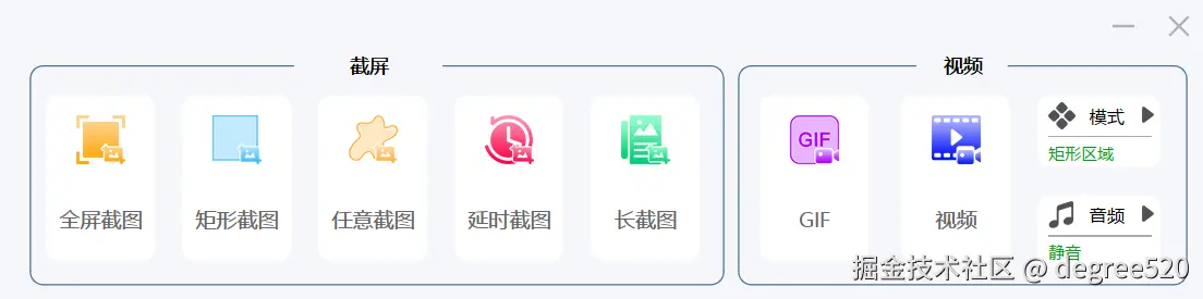- 动画录制:提供全屏、矩形区域两种画面范围,音频可选系统声、麦克风或静音;点击“开始”即可录制 GIF 或 MP4,暂停后自动保存到指定目录。